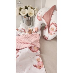 Subtelna gama kolorystyczna oraz dwustronność poduszki ułatwia dopasowanie kolorystyczne do pościeli dziecka.