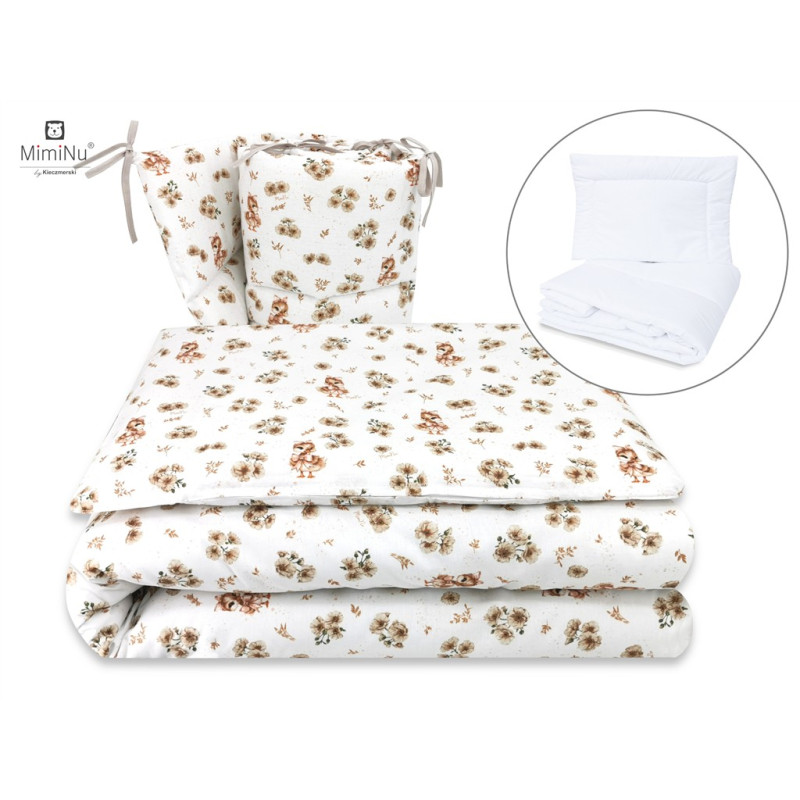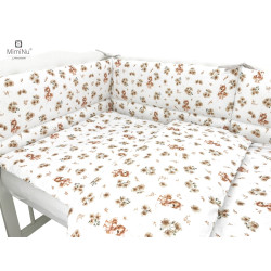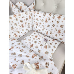 W skład kompletu wchodzi: poszwa 135x100 cm, poszewka 40x60, kołdra 135x100 cm, poduszeczka 40x60 cm oraz ochraniacz 180x30 cm.