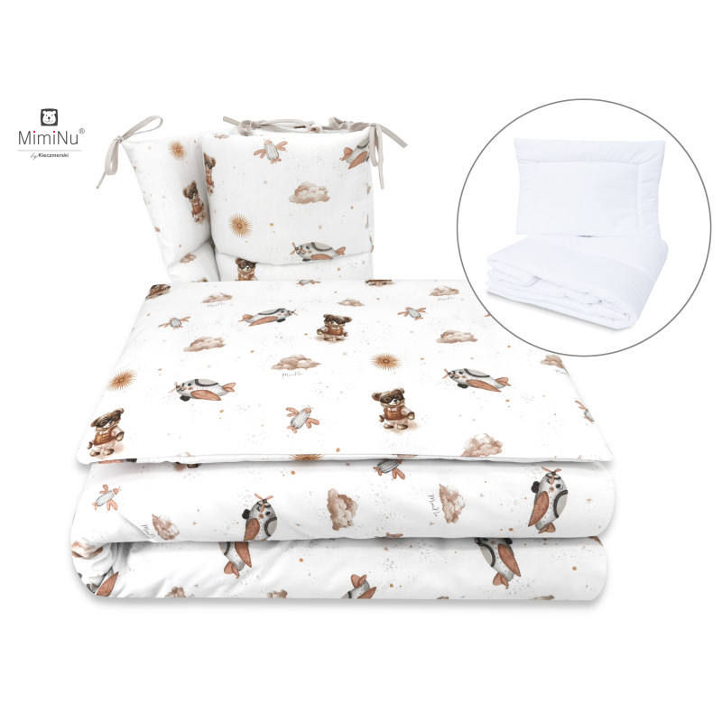 W skład kompletu wchodzi: poszwa 135x100 cm, poszewka 40x60, kołdra 135x100 cm, poduszeczka 40x60 cm oraz ochraniacz 180x30 cm.
