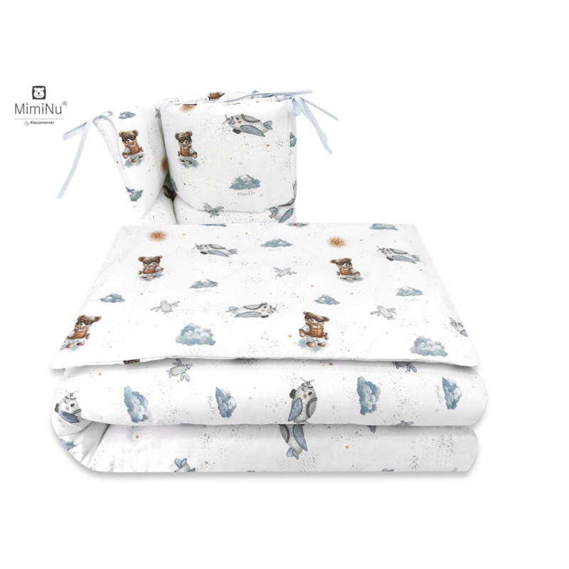 W skład kompletu wchodzi: poszwa 135x100 cm, poszewka 40x60 cm oraz ochraniacz 180x30 cm