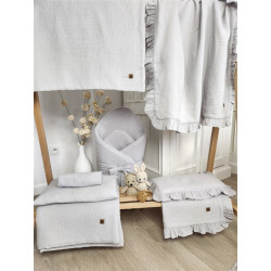 Zestaw: kocyk 75x100 cm z falbanką + poduszka z poszewką z falbanką na suwak 30x40 cm, MUŚLIN BAWEŁNIANY, BAWEŁNA 100%, SZARY