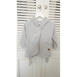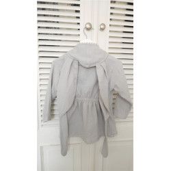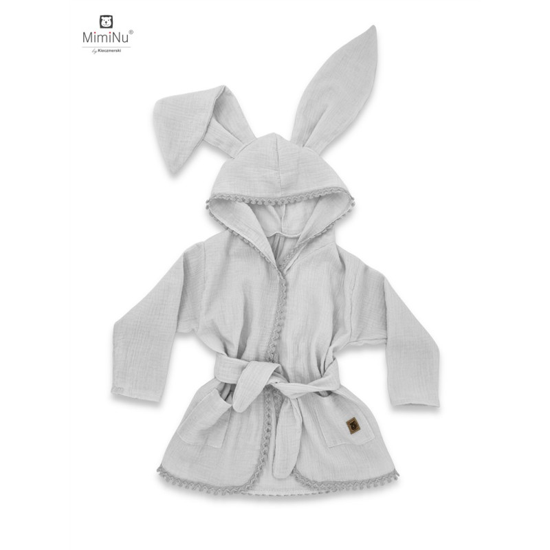 Szlafroczek dziecięcy z kapturkiem i uszami "S" MUŚLIN BAWEŁNIANY (podwójna gaza) SZARY z ozdobną tasiemką