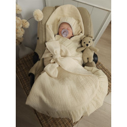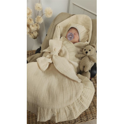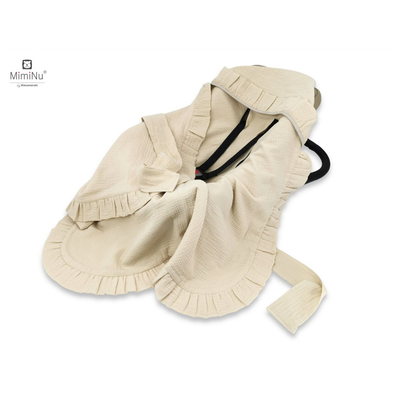 Otulak muślinowy - kocyk letni 90x90 cm Z KAPTURKIEM I FALBANKĄ do nosidełka, fotelika kubełkowego MUŚLIN BAWEŁNIANY CIEPŁY BEŻ