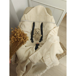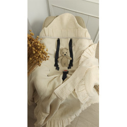 Kocyk ma otwory na każdy rodzaj pasów (nosidełko, wózek, fotelik, krzesełko). Kocyk uszyty jest z 2 warstw puszystego i lekkiego muślinu.
