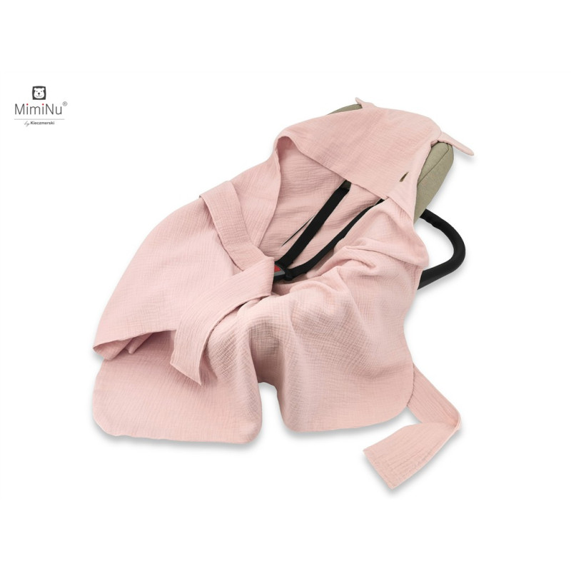 Otulak muślinowy - kocyk letni 90x90 cm Z KAPTURKIEM I USZAMI do nosidełka, fotelika kubełkowego MUŚLIN BAWEŁNIANY PUDROWY RÓŻ