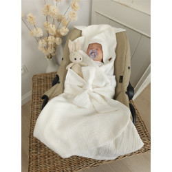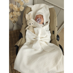 Otulak muślinowy - kocyk letni 90x90 cm Z KAPTURKIEM I USZAMI do nosidełka, fotelika kubełkowego MUŚLIN BAWEŁNIANY ŚMIETANKA