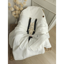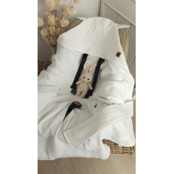 Kocyk ma otwory na każdy rodzaj pasów (nosidełko, wózek, fotelik, krzesełko). Kocyk uszyty jest z 2 warstw puszystego i lekkiego muślinu.